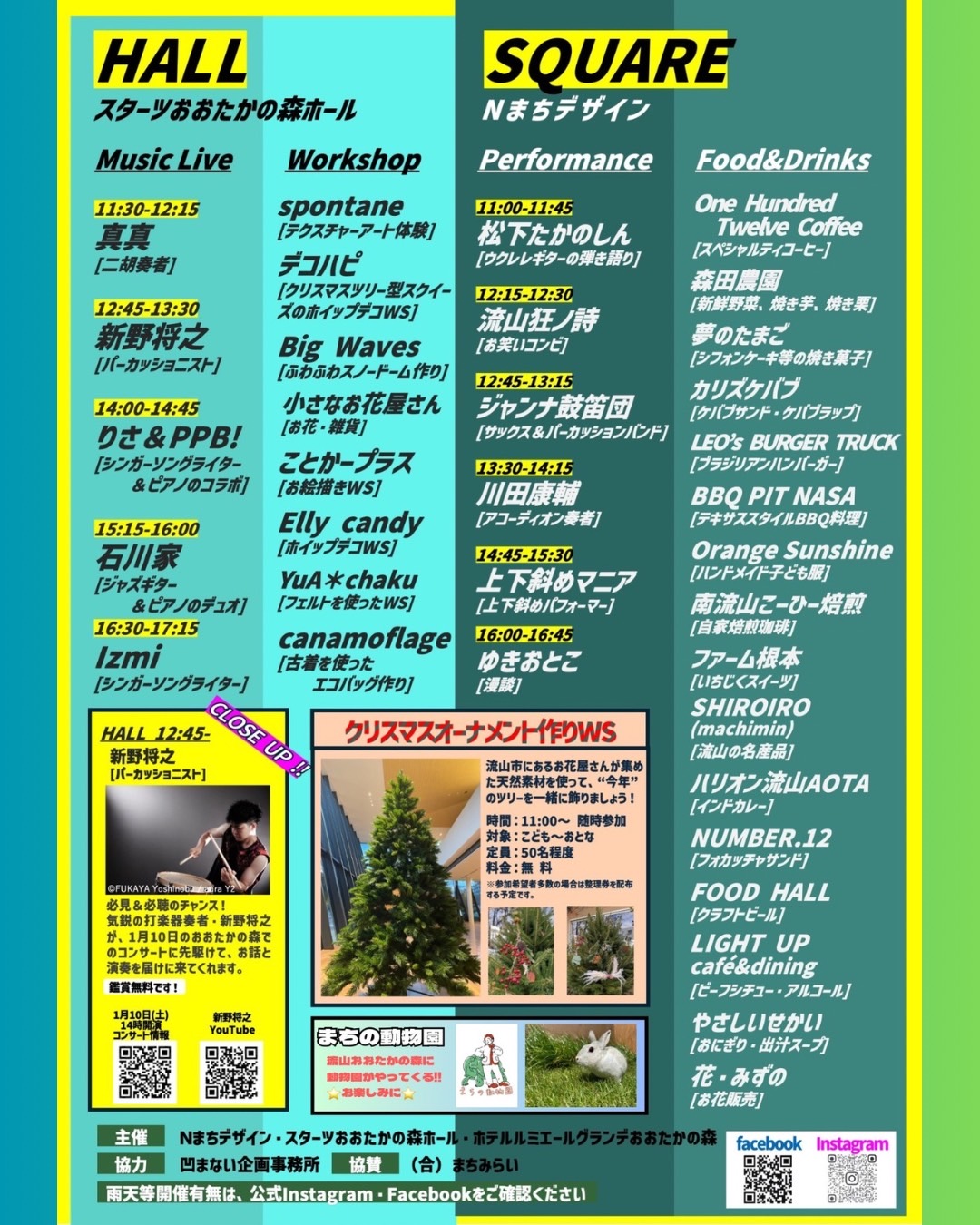 ホールで行われる観覧無料のミュージックライブには、来年1月10日にリサイタルを控えている打楽器奏者、新野将之さんも登場。お見逃しなく!