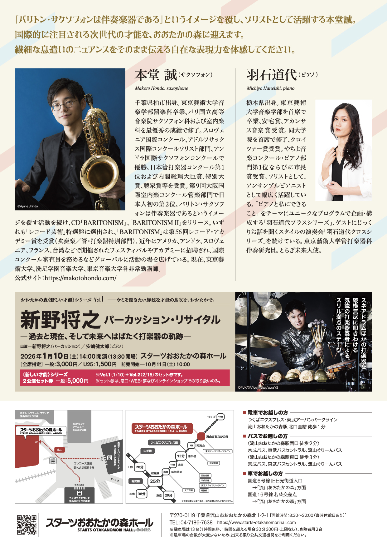 スターツおおたかの森ホールが気鋭の音楽家を迎えて贈るコンサートシリーズ。第2弾の主役はサクソフォン奏者の本堂誠。