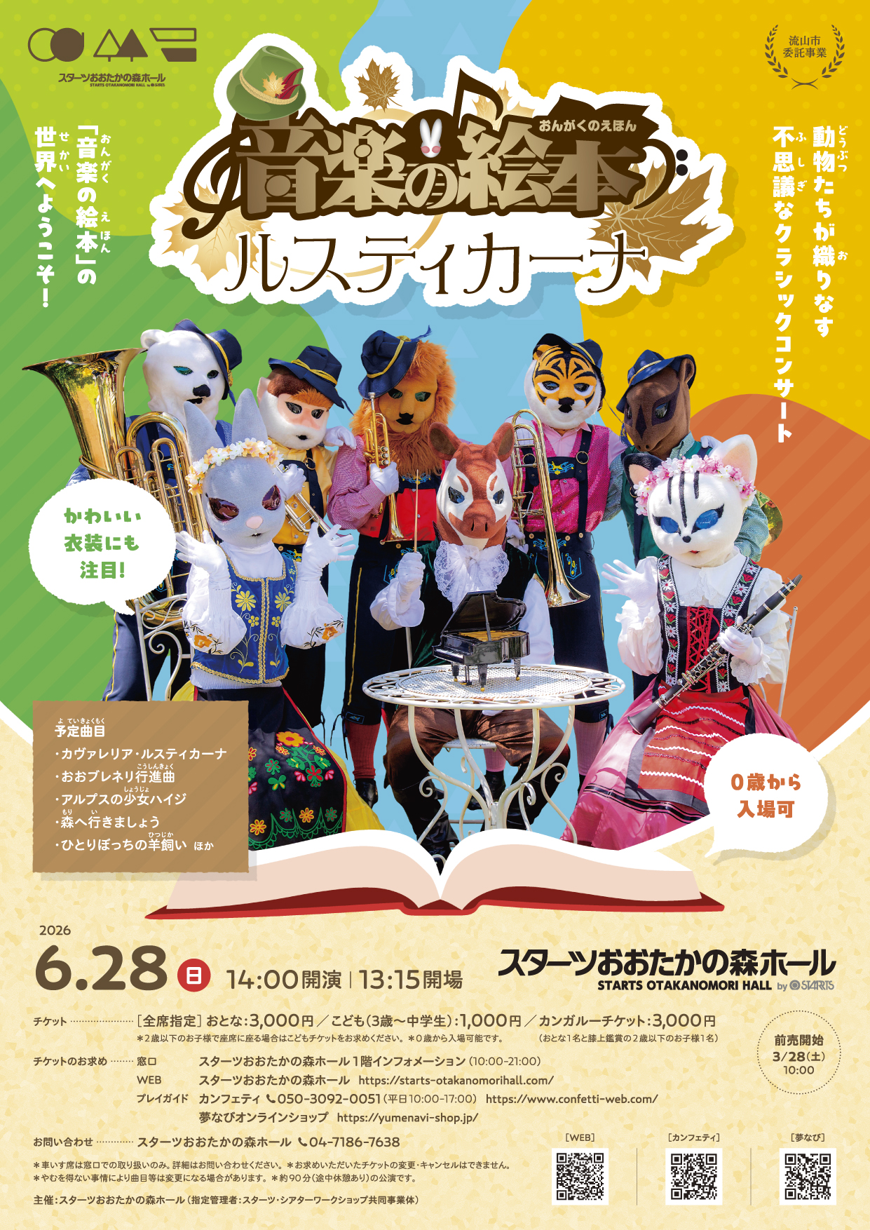 | チケット | 残席僅少(2026年3月28日 前売開始) 2階バルコニー席の販売について — チケットのお求め方法 — ■窓口(来館):スターツおおたかの森ホール1階インフォメーション(10:00-21:00) ■WEB:詳細はこちら ■プレイガイド ・カンフェティ TEL 050-3092-0051/平日10:00-17:00 または カンフェティサイト — ご注意事項 — *車いす席は、スターツおおたかの森ホール1階インフォメーション窓口での取り扱いのみ。詳しくはお問い合わせください。 |