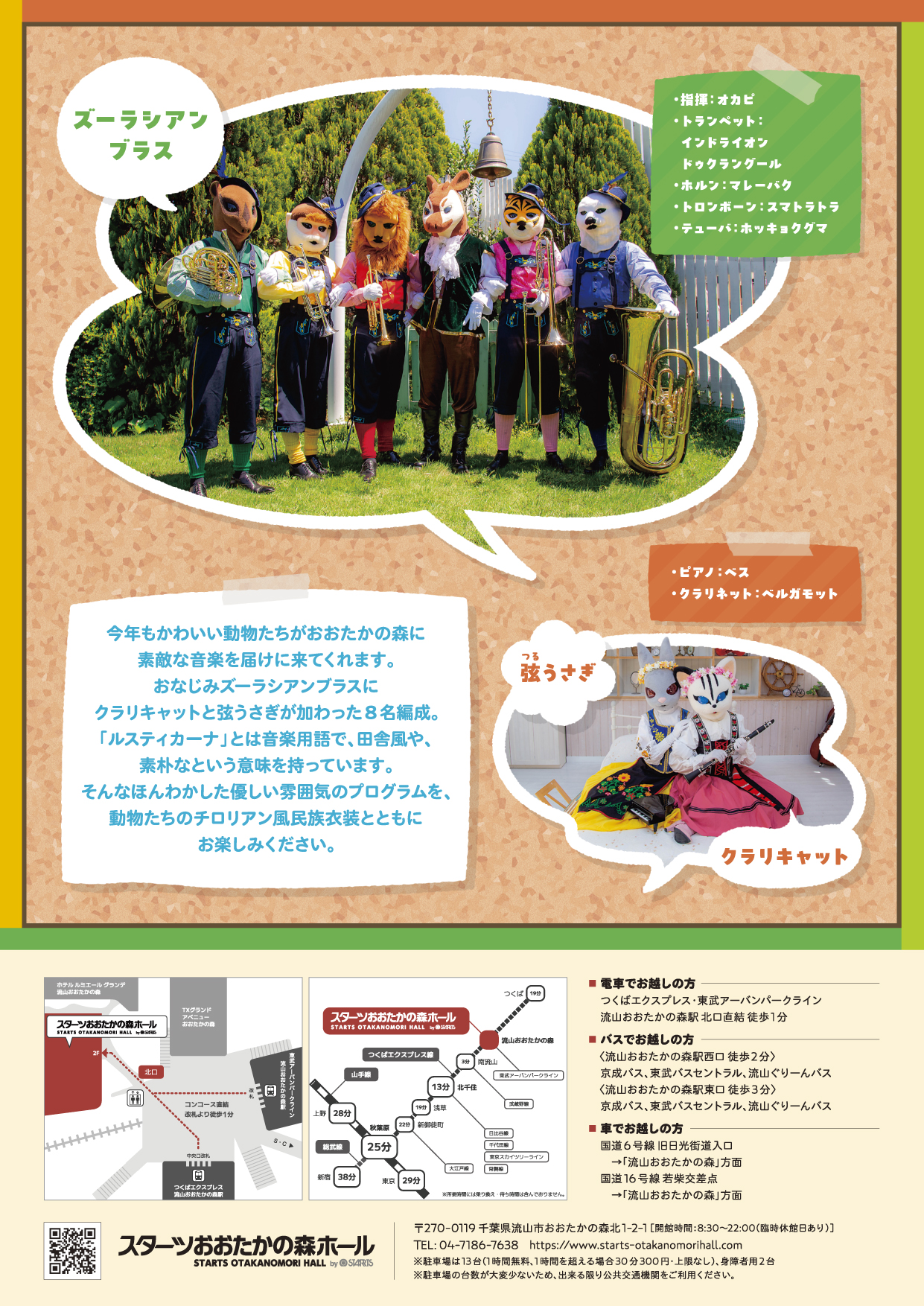 今年もかわいい動物たちがおおたかの森に素敵な音楽を届けに来てくれます。大人気の金管五重奏「ズーラシアンブラス」に、クラリキャットと弦うさぎが加わった8名編成。ぜひご家族一緒にお出かけください。0歳の赤ちゃんから入場可能。
