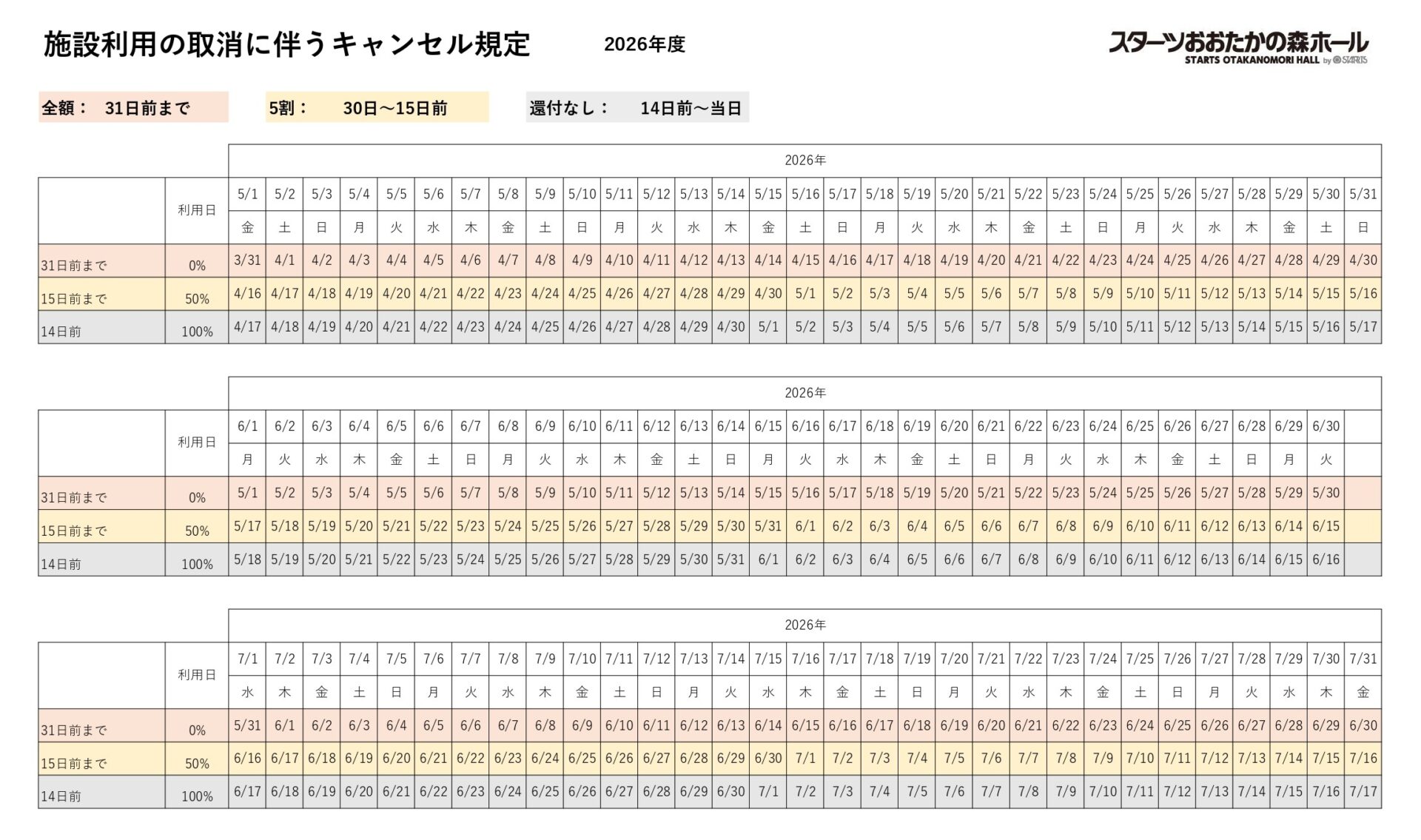 ―15日前まで:システムから取消不可(ご来館のうえキャンセル手続)/50%キャンセル料発生