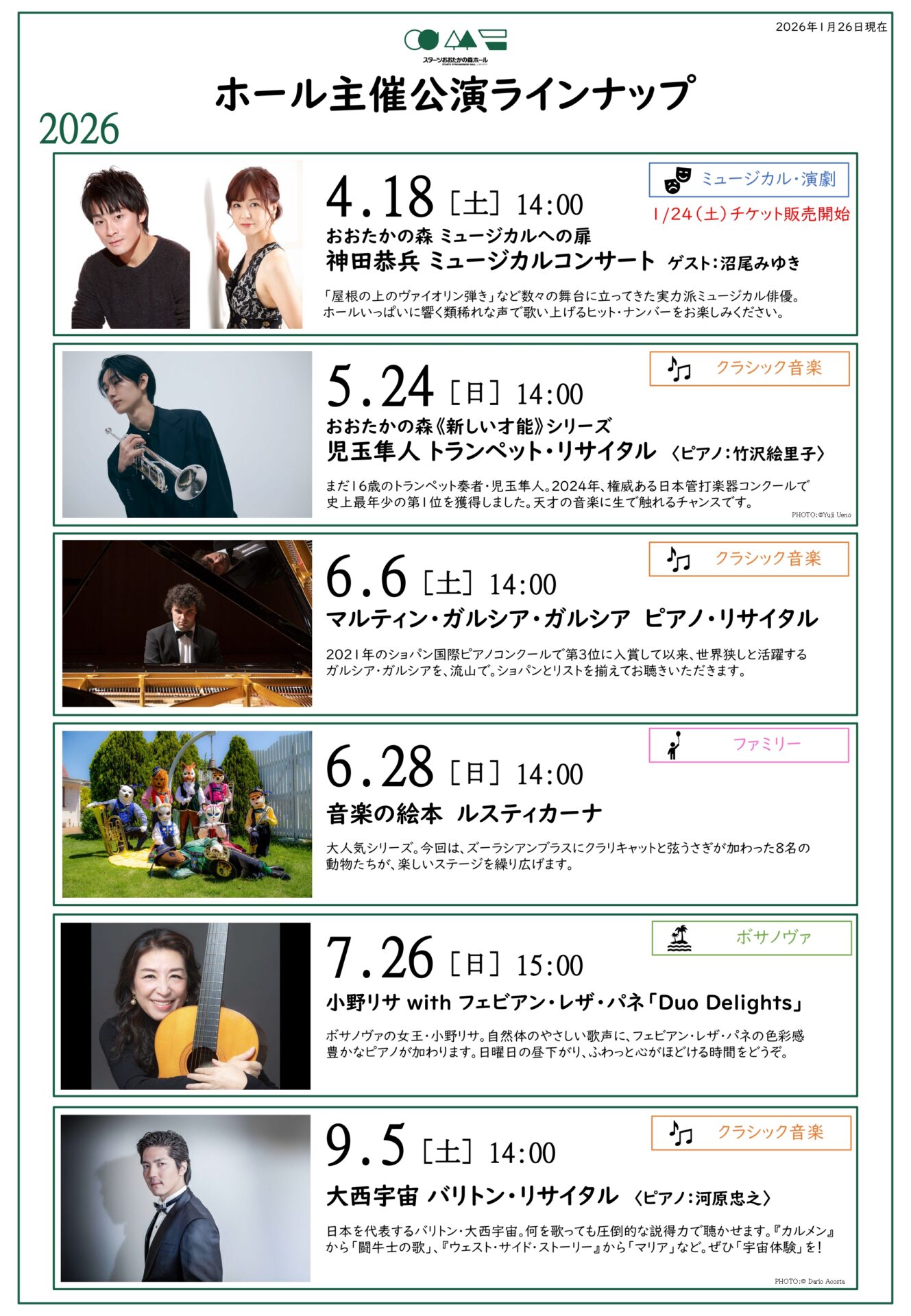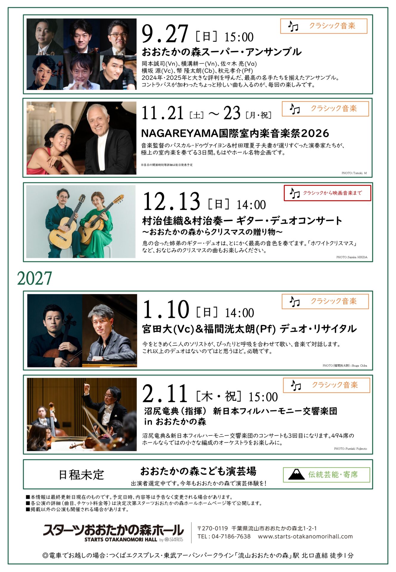 スターツおおたかの森ホール 主催公演ラインナップ 2026-2027 をお知らせいたします。